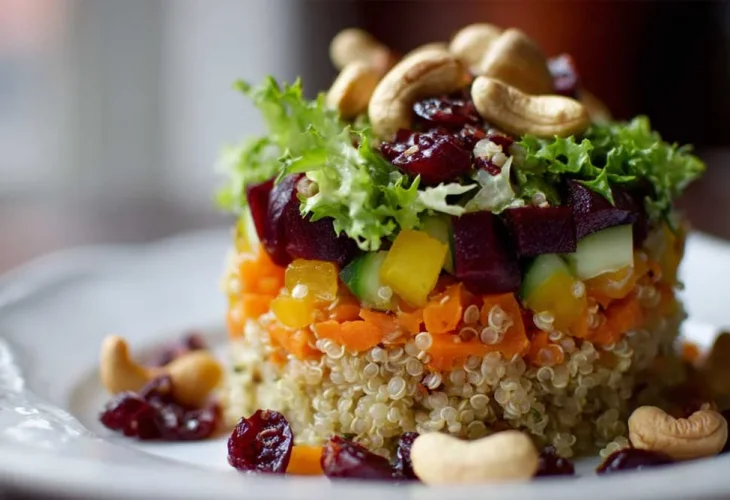 סלט הקינואה נהדר בהגשה בשכבות – קינואה בתחתית, מעל ירקות צבעוניים ולסיום חמוציות וקשיו.