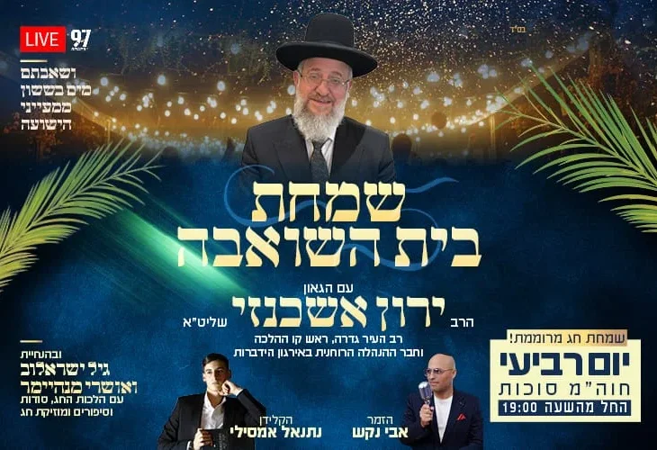 הערב ב- 19:00: שידור חי משמחת בית השואבה המרכזית, מסוכתו של הרב ירון אשכנזי שליט"א. שידור חי באתר ובערוץ הידברות