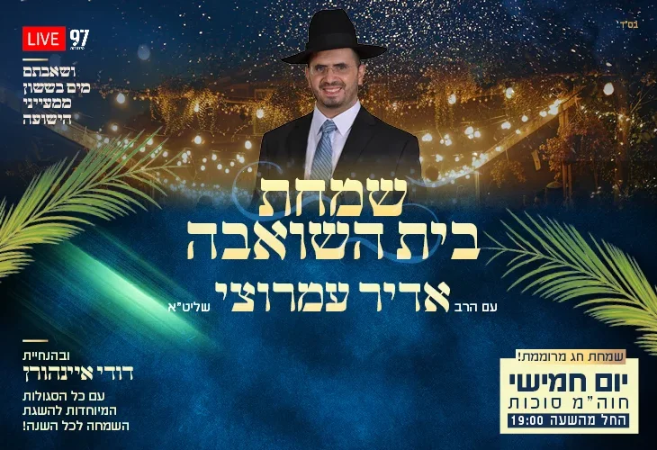 הערב ב-19:00: שידור חי משמחת בית השואבה המרכזית, מסוכתו של הרב אדיר עמרוצי שליט"א, בהשתתפות אורחים ואמנים. שידור חי באתר ובערוץ הידברות