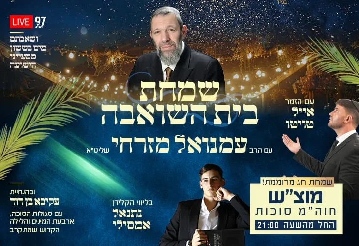 הערב ב-21:00: שידור חי משמחת בית השואבה המרכזית, מסוכתו של הרב עמנואל מזרחי שליט"א, עם סודות וסגולות החג. באתר ובערוץ הידברות
