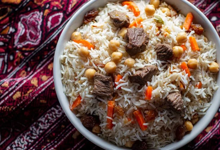 מגישים חם בקערת חרס רחבה. יש שהופכים את תכולת הסיר ומגישים כשהבשר והגזר מעל האורז, ויש שמערבבים ומגישים.