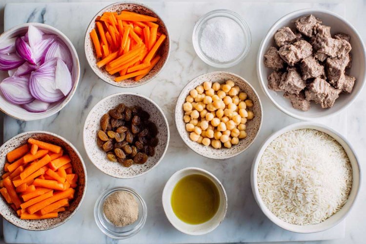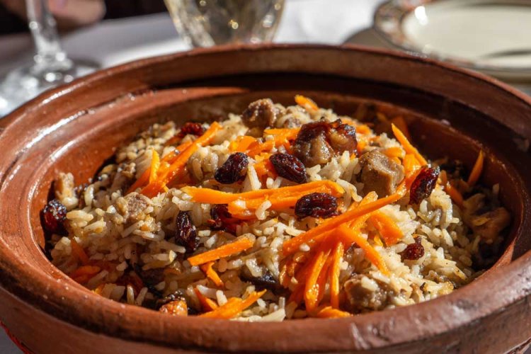 - עוטפים את מכסה הסיר במגבת, סוגרים ומביאים לרתיחה. לאחר 5 דקות מנמיכים את הלהבה ומבשלים כחצי שעה. לאחר מכן מפזרים את הצימוקים וגרגירי החומוס. סוגרים את המכסה ומבשלים שעה נוספת.