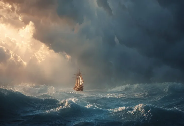 ולפתע, באחת, התחיל הים לרגוז. עבים כבדים הופיעו משום מקום. הקפטן צעק למלחיו, שמיהרו להגיע, תזוזה מהירה, לחוצה, שררה בכל. ברגע הבא הגיע גל ענק, ושטף את כל הסיפון, אם לא די בכך, לאחריו הגיע אחד נוסף, סוחף איתו כל מה שנקרה בדרכו. בערל היה אחד מהנסחפים.