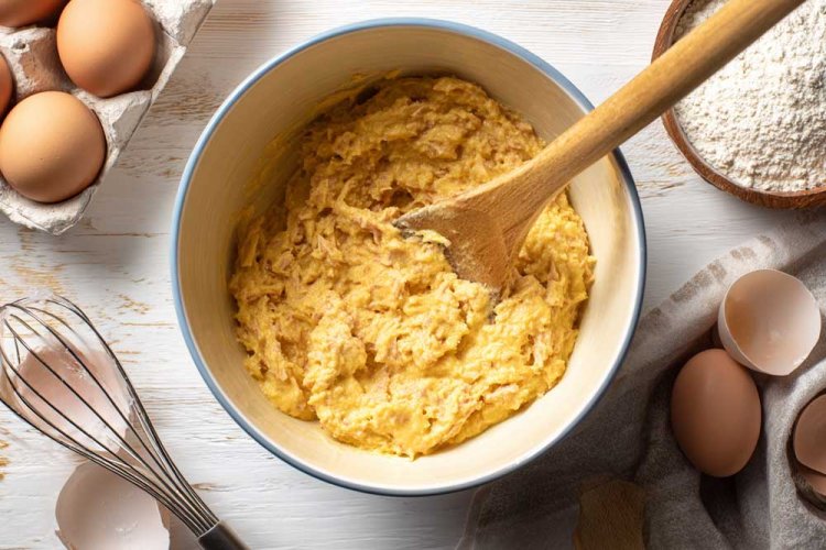 - הוסיפו את הקמח, אבקת האפייה, שמן הזית והתבלינים וערבבו עד שהתערובת הופכת לבצק לח אך לא דביק