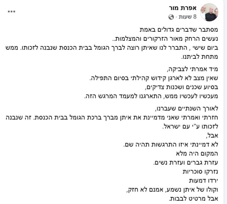 אפרת מור, אמו של איתן שחזר מהשבי בעזה, סיפרה על ברכת הגומל המרגשת שבנה בירך בשבת בבית הכנסת: "נזרקו סוכריות, ירדו דמעות, וקולו של איתן נשמע, אמנם לא חזק, אבל מרטיט לבבות"