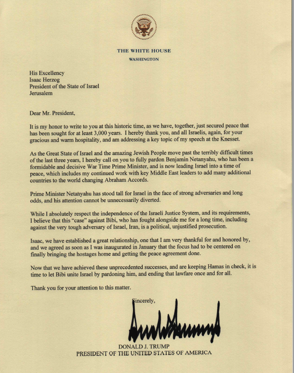 באגרת כתב הנשיא האמריקני: "מדינת ישראל הדגולה והעם היהודי המדהים ממשיכים הלאה מהתקופה הקשה מאוד של שלוש השנים האחרונות, ועל כן, אני קורא לך בזאת להעניק חנינה מלאה לבנימין נתניהו".