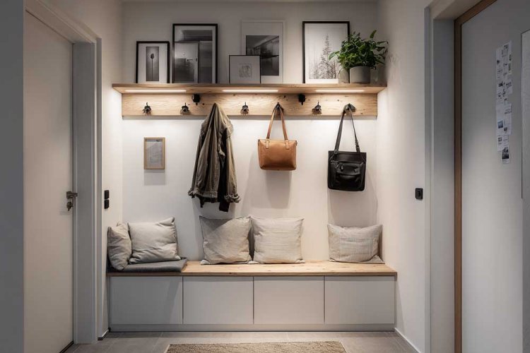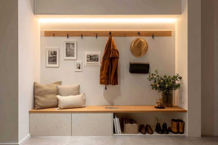 - בכניסה לבית: מתלה משולב בספסל אחסון - מעניק מקום לנעליים, תיקים וקניות כבר בכניסה ומונע מכם להיכנס הביתה עם בלגן.