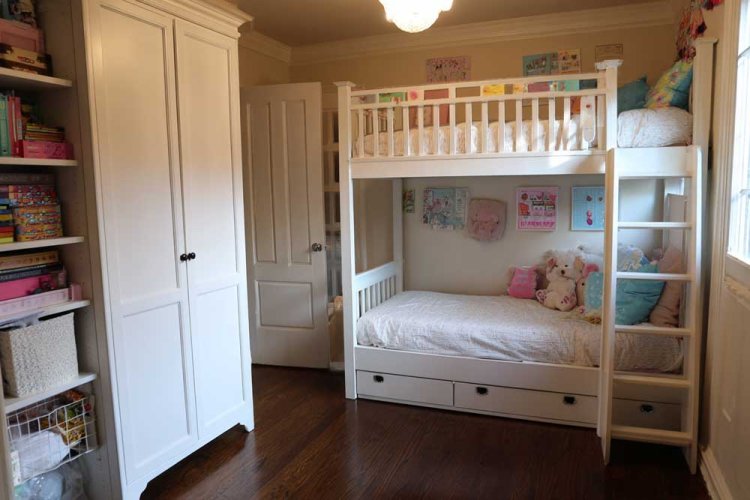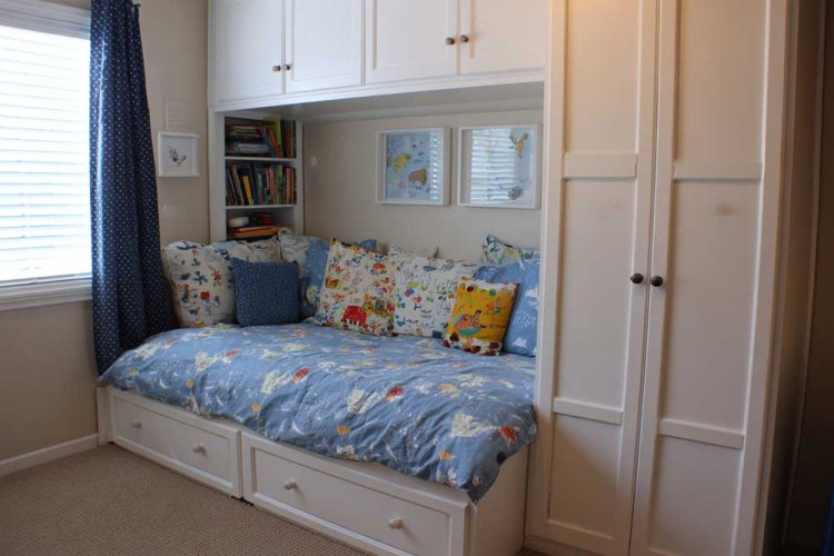 - ארון מותאם אישית - בחדר קטן לא נכניס ארון ענק שיבלע את כל החדר. נעדיף ארון גבוה בעל עומק. כמובן שנחלק מראש את הארון באופן שיספיק לכל בגדי הילדים. כיום אפשר למצוא ארונות בעלי חלוקה חכמה ועומק מתאים להסתרת בגדים עונתיים בחלק אחורי.