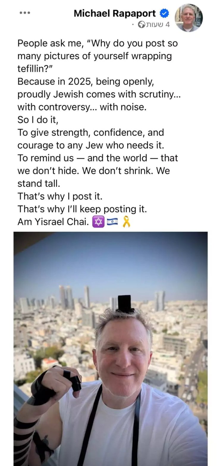 לא כדי להתבלט, אלא כדי להעניק כוח לאחרים.בפוסט שפרסם היום בפייסבוק, כתב רפפורט:"אנשים שואלים אותי, 'למה אתה מפרסם כל כך הרבה תמונות שלך מניח תפילין?' כי בשנת 2025, להיות יהודי בגלוי ובגאווה מגיע עם ביקורת... עם מחלוקת... עם רעש. אז אני עושה את זה כדי להעניק כוח, ביטחון ואומץ לכל יהודי שצריך את זה".