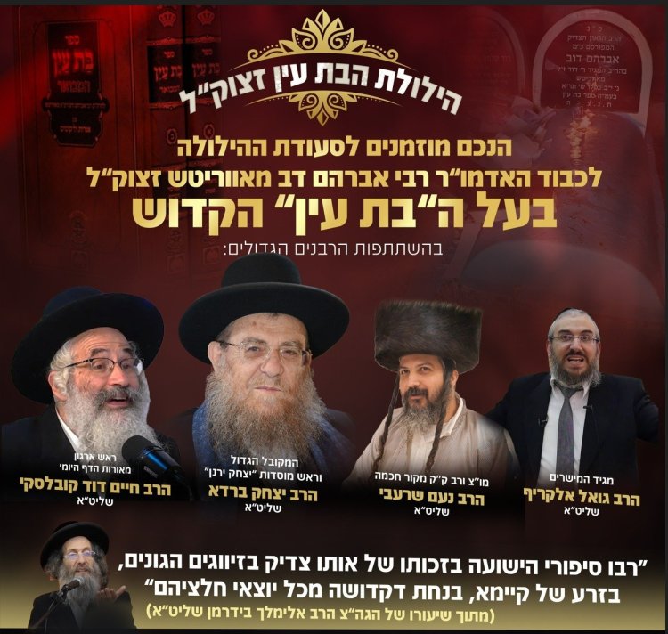 אחד מאותם צדיקים הוא רבי אברהם דוב מאווריטש זצ"ל, בעל ה"בת עין". הספר שכתב - העוסק בהכנעה, ענווה וטהרת הלב - נחשב לאבן יסוד בתורת החסידות, ואנשים רבים שלומדים את משנתו מספרים על שינוי מהותי במידות, בחיבור הרוחני לקב"ה ובאמונה. זאת ועוד: לצדיק זה, שנפטר ללא ילדים ונטמן בצפת, מיוחסת סגולה לפיה כל מי שמקיים סעודה ביום ההילולה שלו בי"ב בכסלו, מדבר מתורתו ועושה דבר מה לעילוי נשמתו - זוכה לישועות גדולות.