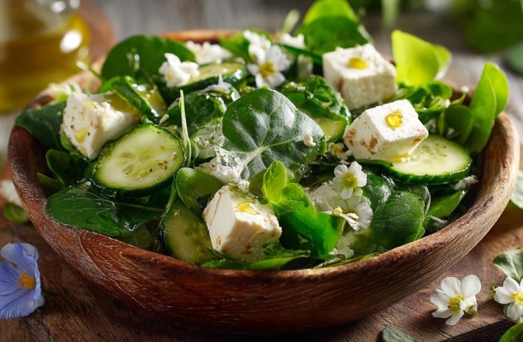 עלי חסה, רוקט וחמציץ עשיר בחמיצות טבעית. מוסיפים קוביות גבינה מלוחה, מלפפון, מעט שמן זית ולימון.
