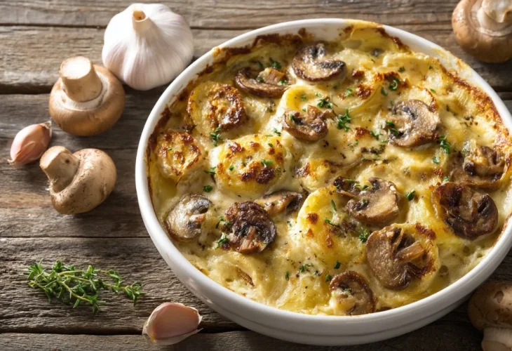 אופן ההכנה: מטגנים את הפטריות עם השום עד שהן מתרככות. מסדרים שכבות של תפוחי אדמה וביניהן את תערובת הפטריות. מוסיפים שמנת, תבלינים ופרמזן. אופים עד שהריח ממלא את המטבח והחלק העליון מזהיב.