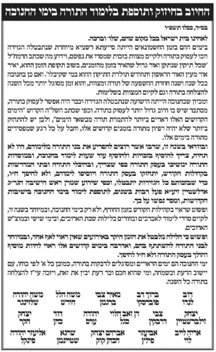 לקראת ימי החנוכה, פרסמו גדולי הדור וראשי הישיבות מכתב מיוחד בו מדגישים הרבנים את גודל המעלה והחיוב להרבות בלימוד התורה בימים קדושים אלו, המסוגלים להתעלות רוחנית, לביטול גזירות ולישועות. עוד קוראים גדולי התורה להתחזק במיוחד בלילות החורף הארוכים ולהוסיף שעות לימוד, בפרט בלילות שבת ובלילות מוצאי שבת.