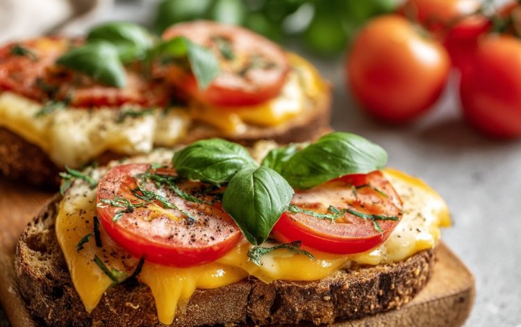 טוסט בריא מלחם מלא עם גבינה צהובה דלת שומן, עגבנייה ועלי בזיליקום.