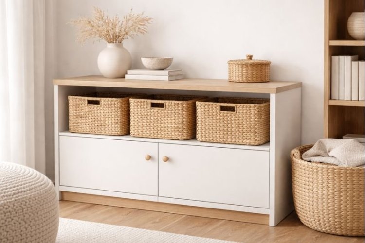 הפתרון שלנו: העדיפו ארונות עם דלתות אטומות. אם יש לכם כוורות פתוחות, השתמשו בסלסלאות אחידות (מבד, קש או פלסטיק איכותי) שמסתירות את התוכן.
