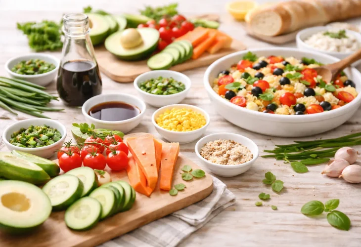 - סלט קוסקוס משביע: מכינים קוסקוס מלא מהיר הכנה. כשהוא מוכן ומאוורר, מערבבים פנימה המון עשבי תיבול קצוצים (פטרוזיליה, כוסברה ונענע), בצל סגול וירוק, עגבניות ומלפפונים קצוצים דק, וזיתים. מתבלים בהרבה שמן זית, מיץ לימון טרי, מלח ופלפל. מנה מרעננת, עשירה ומשביעה במינימום זמן.