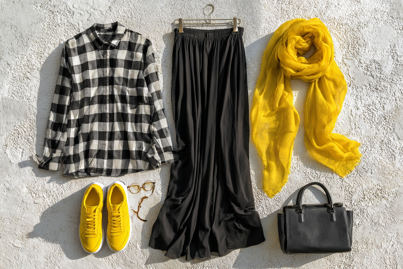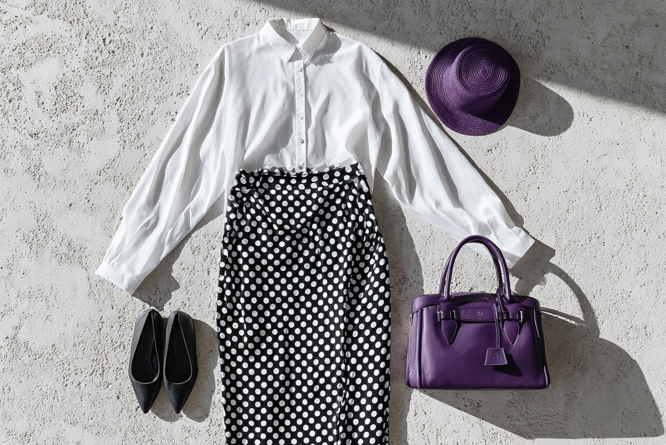 בחרי פריט מרכזי בהדפס שחור-לבן, למשל חצאית מנוקדת. הוסיפי חולצה לבנה או שחורה - זה יהיה הבסיס ללוק. הוסיפי נגיעה אחת של צבע (כמו לדוגמה נעלי סניקרס צהובות, מגפונים כחולים, תיק צד ירוק או קלאץ' ורוד). נגיעת הצבע הצבע יכולה להיות גם באקססוריז (צעיף או כיסוי ראש צבעוני, שרשרת גדולה או חגורה דקה בצבע בולט).