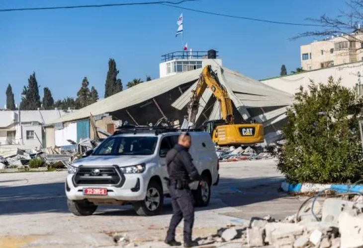 הריסת מבני אונר"א בירושלים (צילום: יונתן סינדל, פלאש90)בטקס סמלי שנערך היום (רביעי) בכניסה למתחם אונר"א לשעבר, בגבעת התחמושת בירושלים, האב השכול קובי סמרנו קבע מזוזה בשער המקום. כך דווח בערוץ 7.