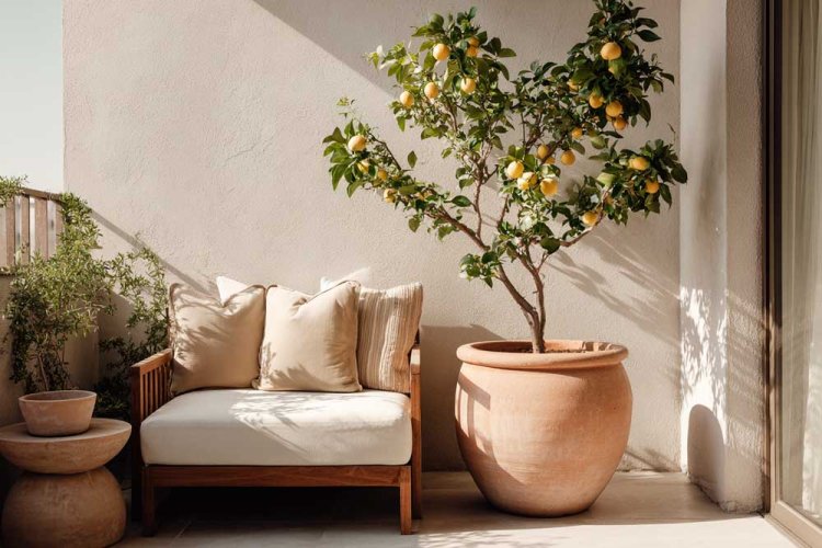 עצי הדר ננסיים, זית או לימון בעציץ יוצרים מוקד עיצובי חזק, מוסיפים גובה ותחושת גינה – גם בקומה גבוהה.