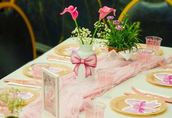 השולחנות הולבשו במפות קטיפה לבנות, עליהן הונחו ראנרים ורודים רכים במראה מרושל ואופנתי. את המפות השכרנו מגמ"ח שכונתי, (היתרון המדהים של לגור בשכונה דתית חרדית), אך כמובן שאפשר להשיג מפות כאלו במקומות אחרים. את הראנרים הזמנתי מ-Shein במחיר סביר בהחלט. לעריכת השולחנות השתמשנו בכלים חד־פעמיים מהסוג האיכותי, העבה יותר. כמובן בגווני ורוד. כלים כאלו אפשר למצוא בכל חנות חד־פעמי ואפילו בסופר הקרוב.