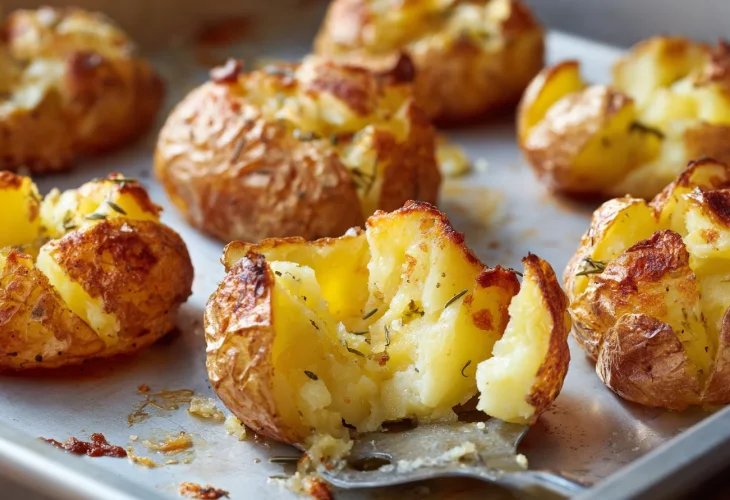 אחרי כ-40 דקות, כשתפוחי האדמה כבר זהובים, אוליבר עוצר את האפייה ומבצע פעולה מפתיעה נוספת. בעזרת מועך תפוחי אדמה, הוא לוחץ בעדינות על כל יחידה. "פשוט תניחו את המועך עליו, תנו לו מכה קטנה ותנו לפנים העמילני והנפלא להתפזר החוצה", הוא מסביר. הפעולה הזו יוצרת שטח פנים גדול יותר, שמוביל לפריכות מוגברת באפייה הסופית.