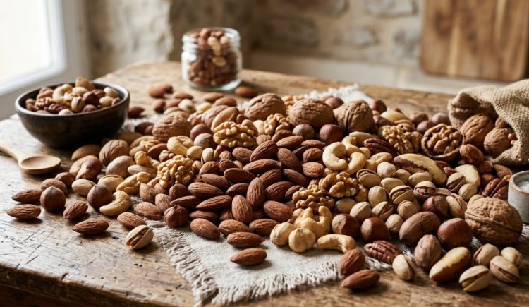 אגוזים ושקדים - אגוזים ושקדים מכילים ויטמין E, אבץ ושומנים חיוניים. רכיבים אלה תורמים לשמירה על עור בריא, מסייעים בהפחתת דלקות ומגנים על תאי העור מפני נזקים.