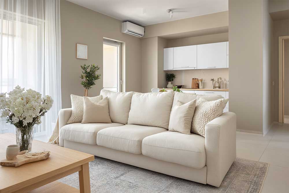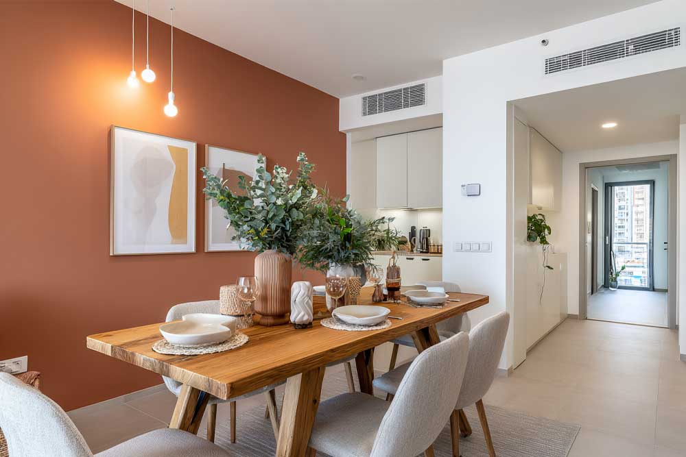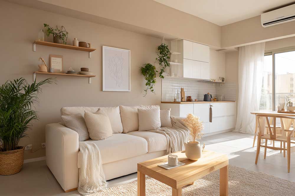 גווני טבעיים בהירים ירחיבו את החלל ובמקביל יצרו אווירה חמימה, כזו שמזמינה ישיבה משותפת סביב שולחן או על הספה.