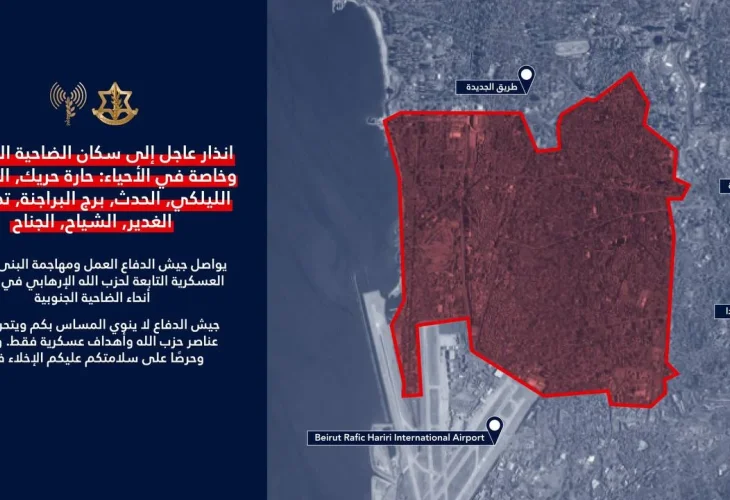 בתוך כך, דובר צה"ל בערבית, אל"מ אביחי אדרעי, פרסם התרעת פינוי חריגה ונרחבת לתושבי הדאחייה שבביירות. בהודעה נמסר: "צה"ל ממשיך לפעול ולתקוף תשתיות צבאיות של חיזבאללה. למען ביטחונכם עליכם להתפנות מיידית". זמן קצר לאחר מכן פורסמה הנחיה מעודכנת, רחבה יותר, הכוללת שמונה שכונות בדאחייה - לראשונה גם את שכונת אלג'נאח - וכן את מחנות הפליטים הפלסטיניים צברא, שאתילא וברג' אלבראג'נה, לצד אזור "עיר הספורט", הסמוך לשדה התעופה הבין-לאומי. בעקבות האזהרות, דווח כי תושבים רבים בדאחייה החלו להתפנות מהאזורים המצוינים.