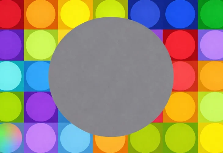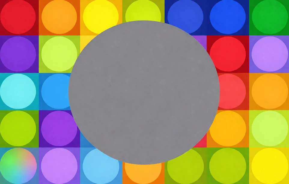 העיגול הגדול שבמרכז התמונה נראה אפור ואחיד, אבל הצבעים הרבים שמקיפים אותו משפיעים על הדרך שבה אנחנו תופסים אותו. המוח שלנו מנסה לקלוט את הסביבה במהירות, ולכן הוא משווה בין צבעים, גוונים וניגודים. כאשר העיגול האפור מוקף בצבעים שונים, המוח מפרש אותו בצורה אחרת, ולעיתים אפילו נדמה שהוא משתנה מעט בהתאם לצבעים שמסביבו.