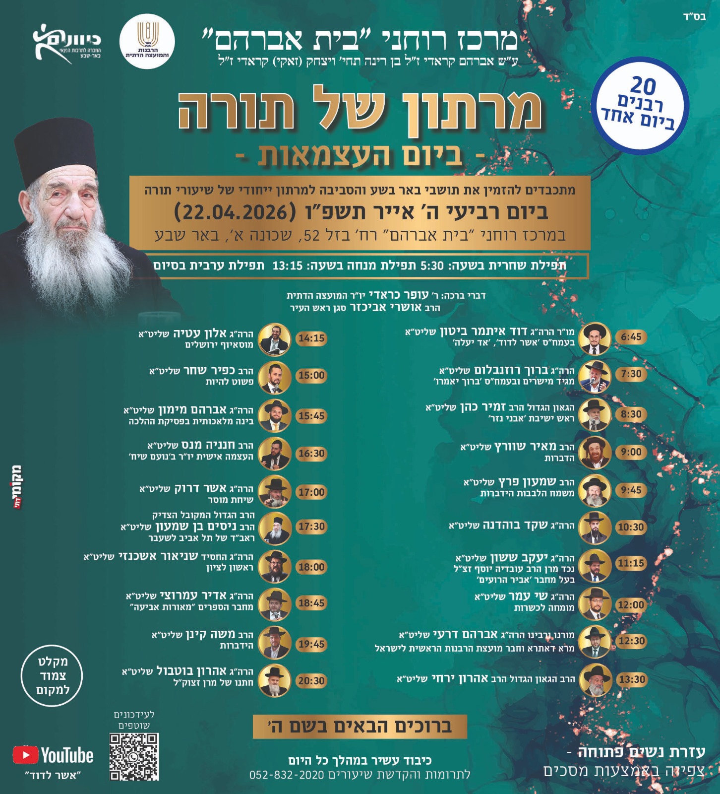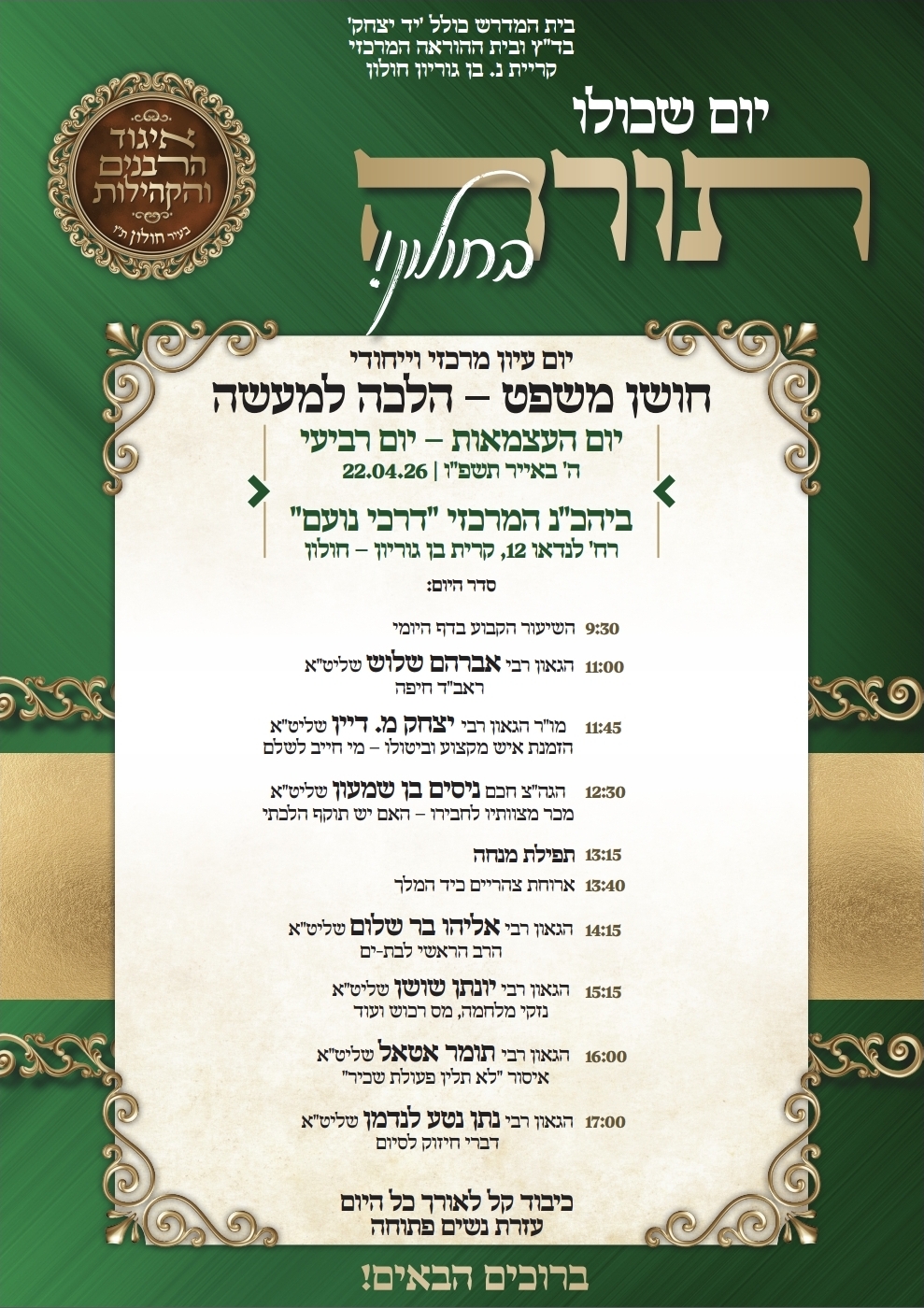 מיטב הרבנים והמרצים מוסרים בכל רחבי הארץ, מהבוקר ועד הערב, מגוון הרצאות מרתקות. זו גם ההזדמנות שלכם למלא את היום החופשי בתורה ועוד תורה, ולהרבות זכויות לעם ישראל. לכם נותר רק למצוא את שיעור התורה הקרוב אליכם – ולהצטרף.