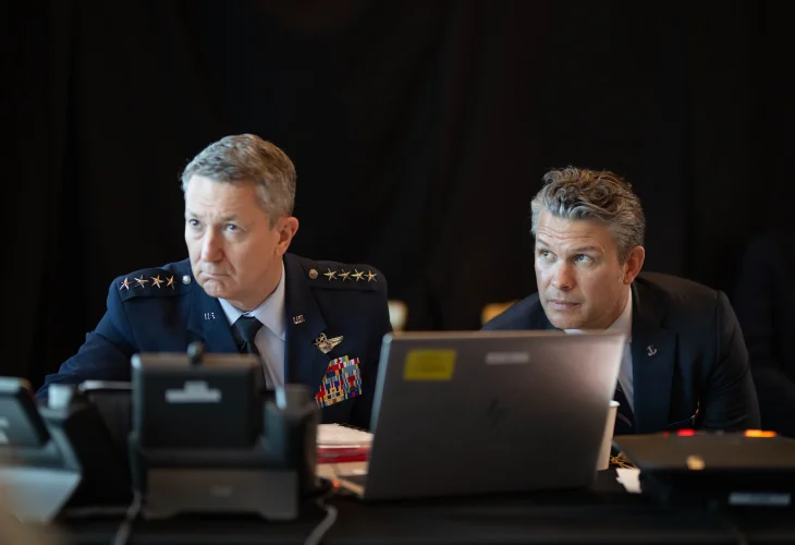 הגסת׳ וקיין (קרדיט: shutterstock)יו"ר המטות המשולבים, הגנרל דן קיין, אמר היום (חמישי) כי צבא ארה"ב "מוכן לחזור לפעילות". לפניו נשא שר המלחמה, פיט הגסת', נאום בו הדגיש כי ארה"ב שולטת כעת במיצר הורמוז. לדבריו, המצור הימי יימשך ככל שיידרש, כחלק מהפעלת לחץ מתמשך על איראן.