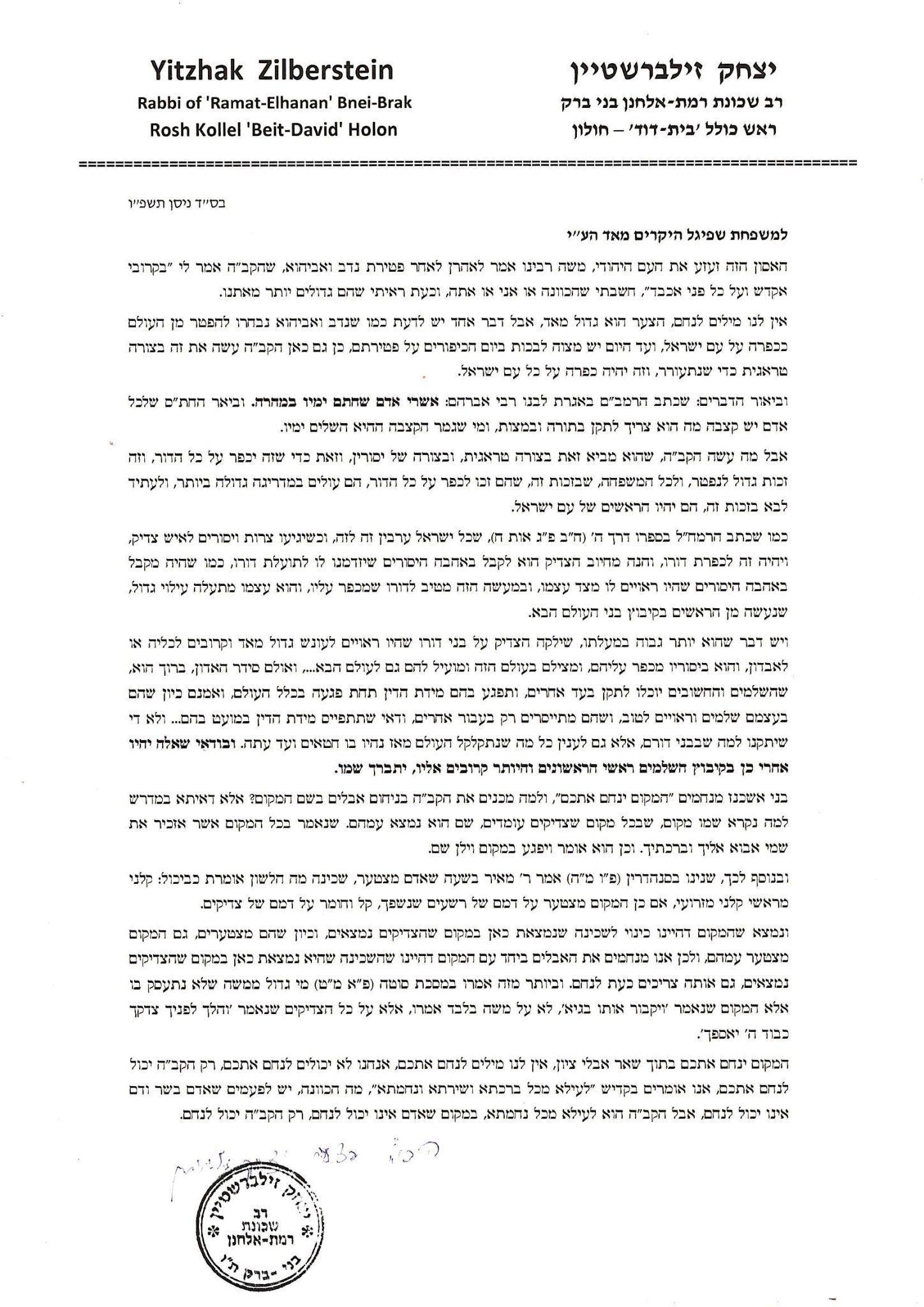"אבל מה עשה הקב"ה, שהוא מביא זאת בצורה טרגית, ובצורה של ייסורים, וזאת כדי שזה יכפר על כל הדור, וזה זכות גדול לנפטר, ולכל המשפחה, שבזכות זה, שהם זכו לכפר על כל הדור, הם עולים במדרגה גדולה ביותר, ולעתיד לבוא בזכות זה, הם יהיו הראשים של עם ישראל.