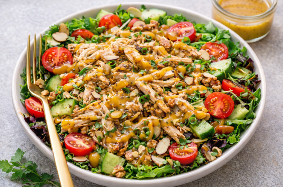 עוף מפורק, חסה, עגבניות שרי, מלפפון, 7 אגוזים/שקדים