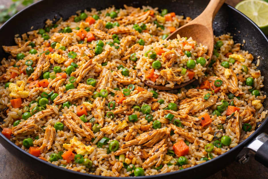 עוף מפורק, אורז מבושל (עדיף קר), ביצה, קוביות גזר, חצי כוס אפונה, 2 כפות רוטב סויה, כף שמן