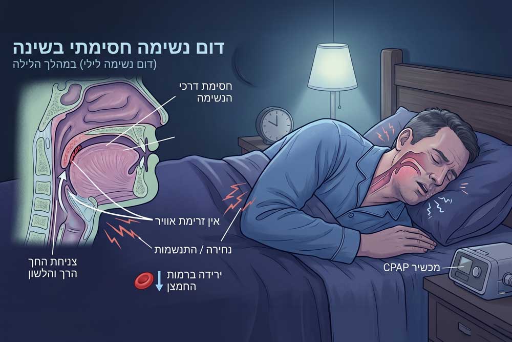 דום נשימה בשינה הוא מצב בו הנשימה נפסקת שוב ושוב במהלך הלילה, לרוב בגלל חסימה בדרכי האוויר. הגוף מתעורר לשבריר שנייה כדי לחדש את הנשימה - לעיתים עשרות פעמים בלילה - בלי שנרגיש. התוצאה היא שינה לא איכותית, עייפות קשה ולעיתים גם סיכונים בריאותיים. טיפול נפוץ הוא מכשיר CPAP שמסייע לשמור על דרכי האוויר פתוחות.