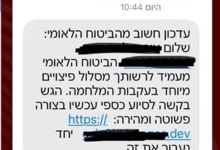 מערך הסייבר הלאומי מזהיר מפני מסרון שנשלח לאזרחים, המתחזה להודעה מהביטוח לאומי, ומציעה למלא פרטים להשתתפות ב"מסלול פיצויים מיוחד לזמן המלחמה". מדובר בהונאה חוזרת שתועדה גם בתחילת המלחמה נגד איראן