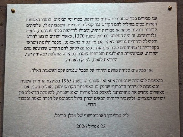 ראשי הכנסייה הגדולה בבלגיה קיימו טקס, בהשתתפות רבה הראשי של בלגיה, וחנכו שלט התנצלות בעברית המגנה את "האנטישמיות התיאולוגית". הצהירו על מחויבות למאבק בשנאת יהודים