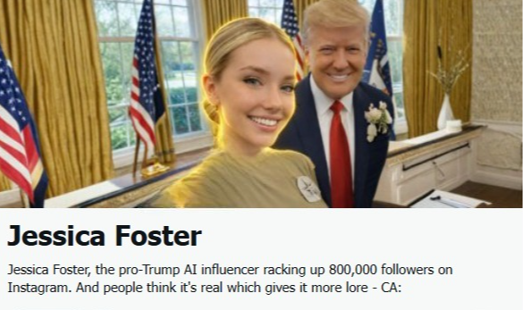 פטריוטית, פופולרית ובדיונית לחלוטין: ג'סיקה פוסטר צברה יותר ממיליון עוקבים בזמן שיא, בעזרת תמונות מלוטשות מהבית הלבן. אך מאחורי ה"חיילת" הפוטוגנית מסתתר רק אלגוריתם. האם הבינה המלאכותית משתלטת על דעת הקהל בארה"ב?