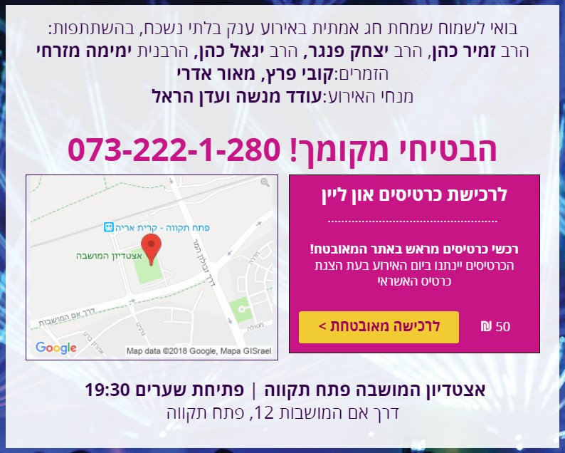 שמחת השנה לנשים, בחול המועד סוכות, יום חמישי 27.9, י"ח תשרי בהנחיית הצמד המפורסם עדן הראל ועודד מנשה, מופע לייזר ענק שלא נראה כמותו בארץ, וכן הזמרים קובי פרץ ומאור אדרי במופע "חוזרים לאבא". לפרטים הקליקו כאן >>